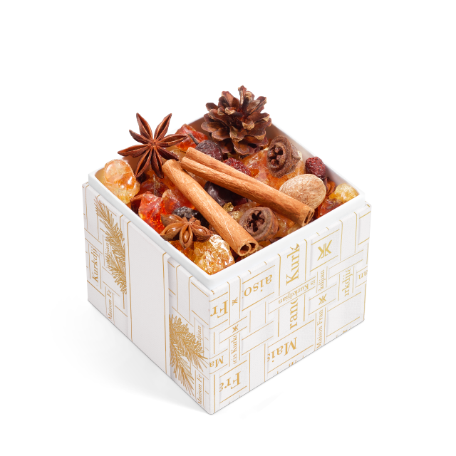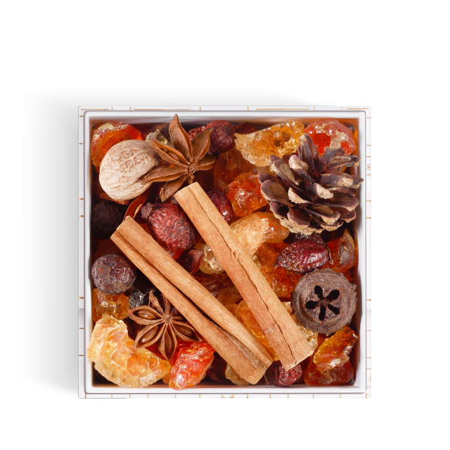 The blend is carefully put together to invoke the feeling of evergreen trees in the winter. The Arabic gum provides a woody and mildly resinous fragrance. Star anise, nutmeg, and cinnamon which enrich delicious Christmas treats make you feel cosy and at home. There’s something cold, fresh and outdoorsy about pine cones and its bright woodiness brings the feeling of Christmas trees.